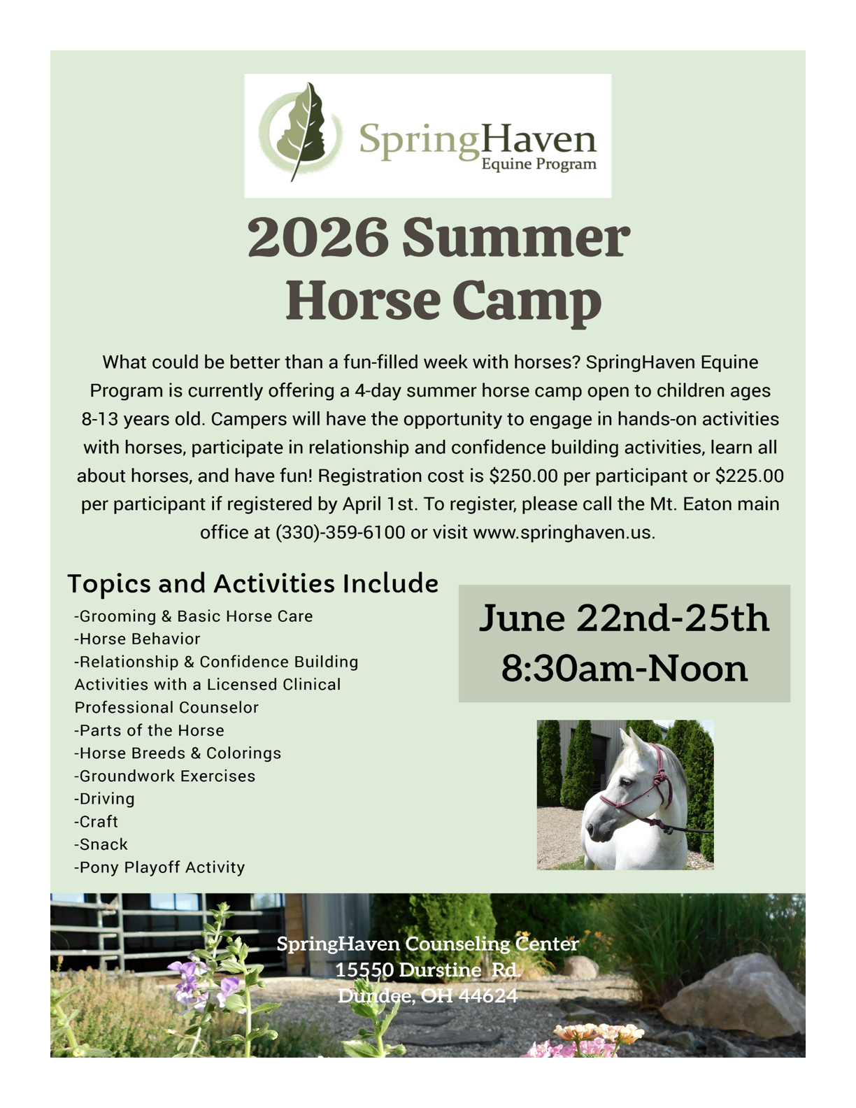 The SpringHaven Equine Program offers a four-day summer horse camp(s) open to children ages 8-13 years old. Individuals will have the opportunity to engage in hands-on activities with horses, participate in relationship and confidence building exercises, and learn all about horses!